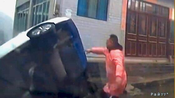 Житель китайской деревни, оказавшийся на месте неудачного проезда легковушки, попытался предотвратить автокатастрофу.