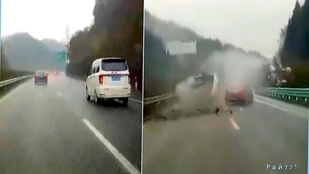 Минивэн угодил в аварию и рассыпался на глазах у автомобилистов в Китае