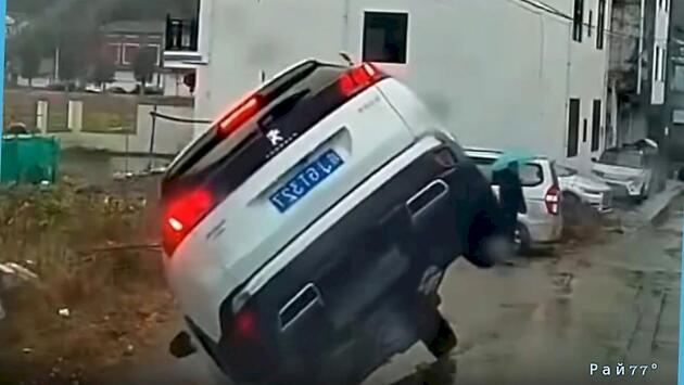 Владелец внедорожника французского производства не заметил съезда и ступеньку на обочине сельской дороги, в результате чего автомобиль съехал и на несколько секунд оказался балансирующим на трёх колёсах.