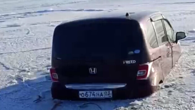 Очевидцы запечатлели инцидент. На кадрах автомобиль Honda, который вмерз в лед. При этом видно, что машина только наполовину погрузилась в Байкал.