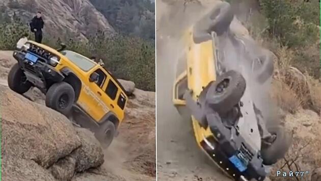 Автоэкстремалу почти удалось преодолеть утёс и зрелищно угробить внедорожник