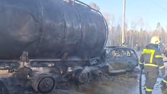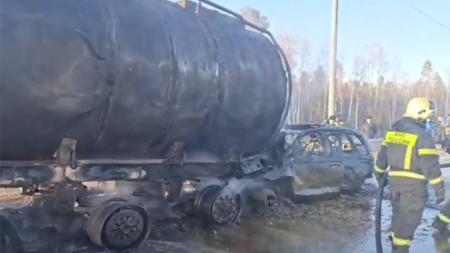 Там легковой автомобиль столкнулся с автоцистерной, перевозившей талловое масло. После столкновения загорелись и машины, и разлившееся масло.