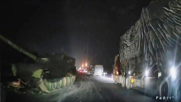 Судя по кадрам видеозаписи, сделанной поздней ночью 26 февраля, поступившей в распоряжение Рай77°, перевозивший танки грузовик врезался в разделительный барьер, в результате чего одна из бронемашин оказалась на встречной полосе. Очевидец странного ДТП объехал неожиданное препятствие на своей легковушке и запечатлел на видеорегистратор инцидент.