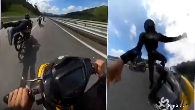 Автор видеоролика, полученного Рай77°, врезался в упавшего перед ним мотоциклиста и запечатлел серию кувырков, падений и столкновений в собственном исполнении. Со слов мотоциклиста, в результате происшествия никто серьёзно не пострадал.