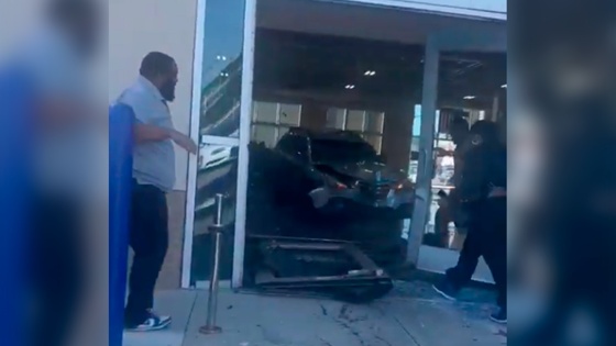 Сообщается, что разбитый внедорожник въехал в здание задним ходом, затем внутри развернулся и выехал с другой стороны здания. По данным представителей автосалона, водитель за рулем авто был их клиентом и перед инцидентом случился спор с сотрудниками салона.