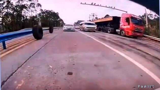 Дальнобойщик на фуре устроил заезд наперегонки с отлетевшими покрышками