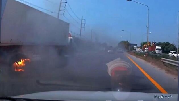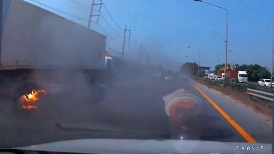 Автомобильный видеорегистратор запечатлел охваченное пламенем колесо, которое устремилось в сторону легковушки, принадлежащей автору видео, который прервал заезд, но затем устремился вдогонку за уехавшим с места ДТП грузовиком.