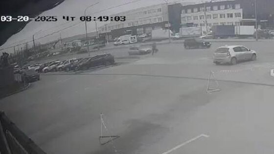 На кадрах видно, что человек выбежал на проезжую часть вне зоны перехода. Удар, нанесенный машиной, был такой силы, что пешехода отбросило на несколько метров.