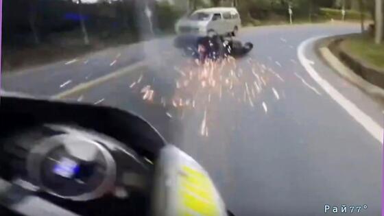 Один из участников заезда по извилистой китайской магистрали, запечатлел, как его коллега, прочертил металлической частью байка по дорожному полотну, вывзвав искры, а затем каким-то чудом не влетел в передвигающуюся в противоположном направлении легковушку.