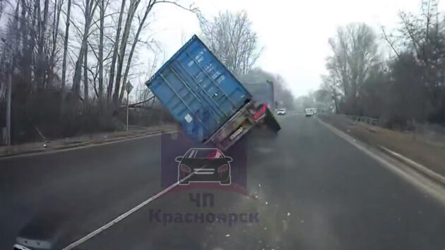 В Красноярске большегрузный автомобиль с полуприцепом опрокинулся на встречную полосу, едва не задев проезжавшие автомобили. Видеозапись инцидента опубликовал Telegram-канал «ЧП Красноярск».