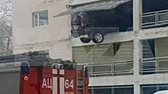 На опубликованных в сети кадрах видно, что черная машина находится на третьем этаже парковки, при этом его задняя часть висит в воздухе.