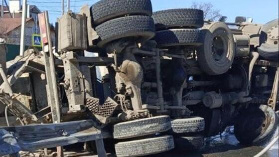Утром у КамАЗа в районе территории Дома ЭМО 1 отказали тормоза. 27-летний водитель попытался затормозить об отбойник, но бетономешалка опрокинулась и столкнулась с ехавшим впереди Hyundai.