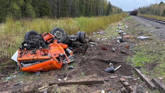 По данным ведомства, авария произошла на переезде. После столкновения поезд не сошел с рельсов и проехал дальше еще километр, после чего затормозил. Судя по опубликованным фото, от удара грузовик перевернулся и получил серьезные повреждения. Кабину смяло, груз был разбросан по округе.