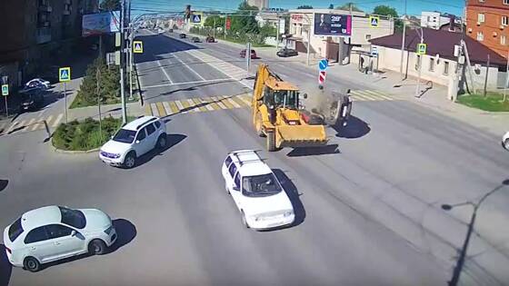 В левой полосе двигался Nissan Qashqai, который Caterpillar буквально «подцепил» своим ковшом. В результате столкновения кроссовер перевернулся, совершив эффектный кульбит.
