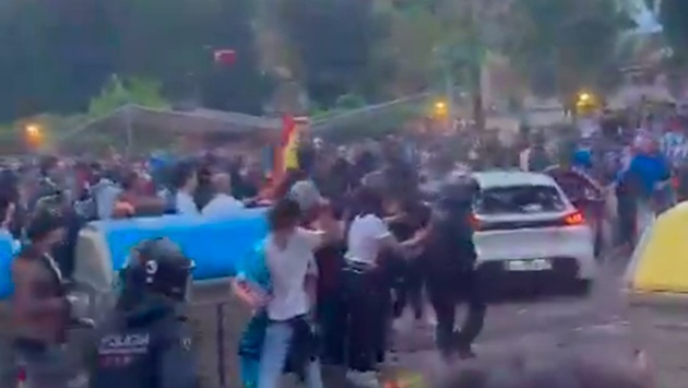 На кадрах, снятых очевидцами, видно, как белая иномарка сначала просто стоит в толпе - футбольные фанаты закидывают ее бутылками и мусором, после чего водитель резко нажимает на газ и въезжает в толпу. По данным издания, за рулем находилась девушка, ее задержали.