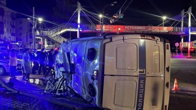 «Лада Приора» столкнулась с полицейским автомобилем. От удара служебная машина перевернулась и упала на велосипедиста.