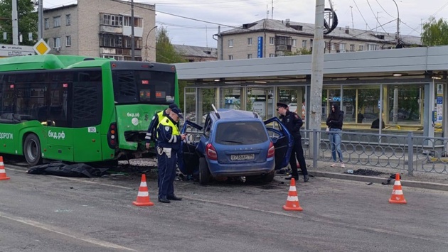 В Екатеринбурге LADA врезалась в стоящий на светофоре автобус, водитель погиб