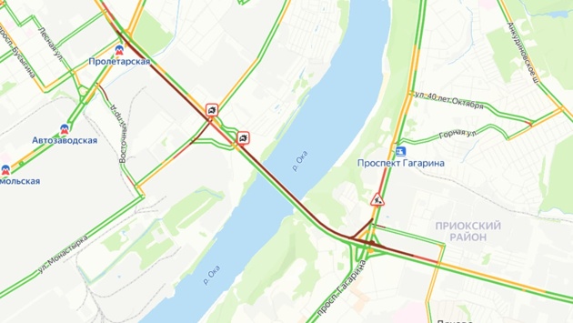 Серьезная пробка образовалась на Мызинском мосту в Нижнем Новгороде вечером 19 мая. Она тянется от проспекта Гагарина до проспекта Ленина. Об этом свидетельствуют данные сервиса «Яндекс. Карты».