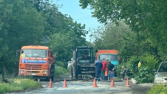 Поврежденный участок дороги огородили сигнальными конусами. Ремонт трубопровода планируют закончить сегодня до 18:00.