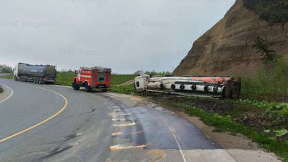 МЧС: на Сахалине произошла утечка 1,5 дизельного топлива из упавшего бензовоза