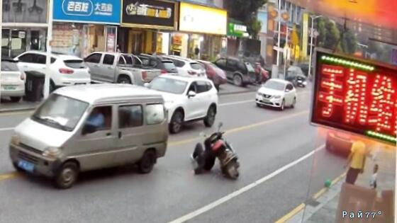 Китаец бросил мотоцикл и избежал столкновения с фургоном и ребёнком
