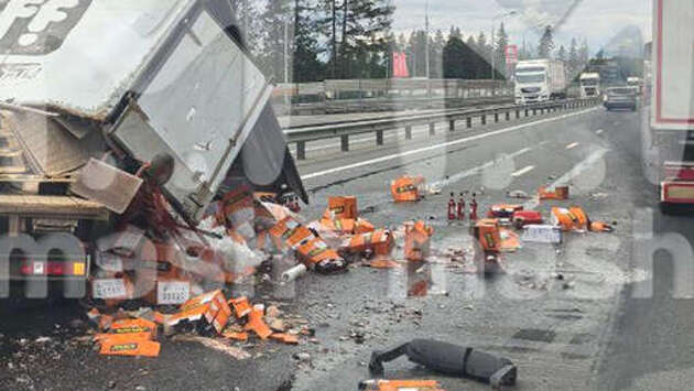 На ЦКАД фургон с Аперолем рассыпал бутылки по трассе и заблокировал движение