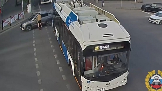 Момент дорожного инцидента попал на камеру видеонаблюдения. На опубликованных кадрах видно, как на перекресток выехал троллейбус и остановился. В это время водитель электросамоката промчался вдоль общественного транспорта и не заметил, как на пересечение дорог уже выехал автомобиль. В результате произошло столкновение.