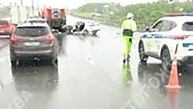 Смятая из-за удара легковушка в Подмосковье попала на видео