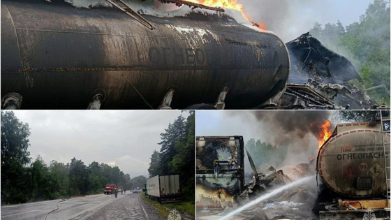 В официальном заявлении ведомства говорится о столкновении трех грузовых автомобилей, включая бензовоз, перевозивший топливо, которое разлилось на месте аварии. К сообщению были приложены фотографии пылающего бензовоза.