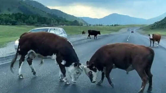 В Горном Алтае быки бодались на проезжей части. Об этом сообщает Telegram-канал Mash Siberia. "Быки устроили битву за любовь на дороге в Горном Алтае. Замес случился сразу на двух полосах, поэтому водителям пришлось аккуратничать и стараться не отвлекаться на поединок", - говорится в сообщении. Очевидцы запечатлели инцидент на видео. На кадрах видно, как два быка бодаются на дороге среди проезжающих машин. До этого сообщалось, что в Санкт-Петербурге водитель спас котенка на обочине дороги. По информации канала, водитель посадил животное в салон автомобиля и понял, что у котенка больные глаза. В настоящее время животное живет в квартире. Очевидец запечатлел инцидент на видео. На кадрах видно, как рыжий котенок сидит на обочине дороги, откуда его забирает водитель и сажает в машину. Далее на записи, снятой в квартире видно, что глаза котенку уже вылечили. Кроме того, на Кубани Hyundai Solaris врезался в стадо баранов.
