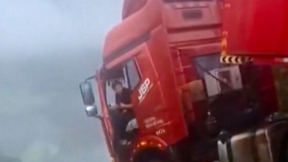 В Китае на фоне обильных дождей и оползней водитель фуры застрял в кабине над обрывом. Видеозапись инцидента публикует metro.co.uk