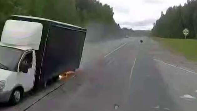В Карелии на видео попало, как грузовик воспламенился из-за отлетевшего колеса