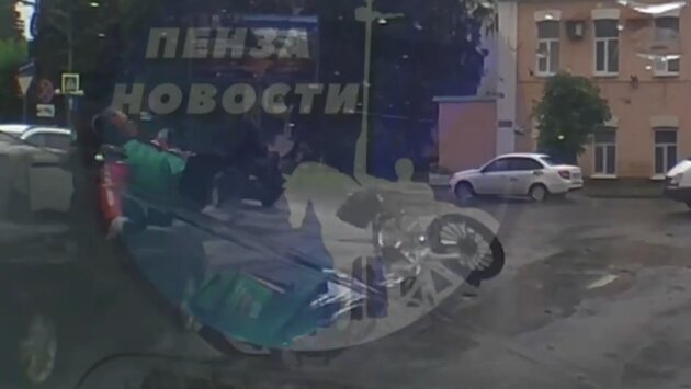 В Пензе видеорегистратор водителя снял момент ДТП на улице Захарова. Под колеса легковой машины попал доставщик еды.