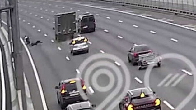На МКАД на видео попало, как мотоциклист отлетел от удара грузовика