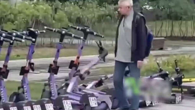 В Москве мужчина повалил самокаты по принципу домино и попал на видео