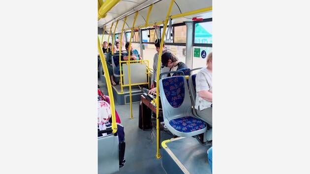 Двое юношей расположили аппаратуру внутри транспортного средства. Один из них сыграл на диджейском пульте во время поездки по Стерлитамаку. При этом в автобусе находились пассажиры разных возрастов, которые внимательно следили за движениями музыканта.