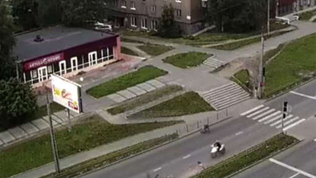 Уличная камера запечатлела инцидент. На кадрах видно, как после столкновения мотоциклисты разлетаются по проезжей части.