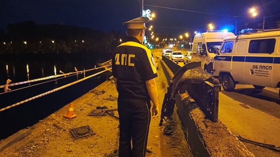 Судя по опубликованным органами кадрам с наружных камер, тонированная иномарка на большой скорости несется по дороге, врезается в ограждение и падает с высоты в воду.