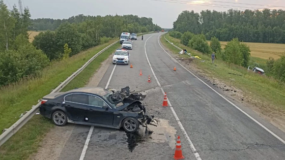 По предварительной информации, 26-летний водитель BMW выехал на встречную полосу, где произошло лобовое столкновение с микроавтобусом. От удара легковой автомобиль развернуло, его передняя часть полностью деформирована. Микроавтобус после столкновения съехал в кювет.