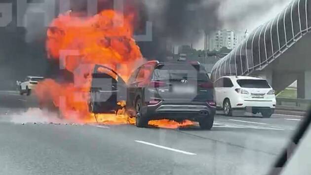 На кадрах виден объятый пламенем корейский автомобиль Hyundai Santa Fe. Известно, что возгорание и взрыв произошли на 32-м километре Московской кольцевой автодороги (МКАД). Как сообщает источник, по предварительным данным, в результате инцидента никто не пострадал.
