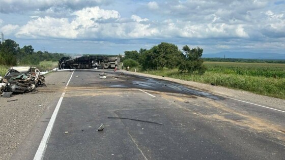 Свидетели утверждают, что в грузовик врезался автомобилист за рулём Toyota Corolla, ехавший с превышением безопасной скорости. Тягач от столкновения перевернулся. Легковушка тоже получила серьёзные повреждения, но её водитель выжил. В социальных сетях сообщают, что виновник ДТП был пьян.