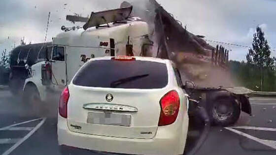На видео попал момент массового ДТП с фурой и лесовозом в Ленобласти