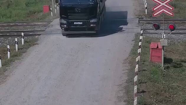 На кадрах видно, как большегруз въезжает на регулируемый железнодорожный переезд. В это время включен сигнал, извещающий о приближении поезда. Через несколько секунд происходит столкновение, от удара автомобиль выбрасывают в кювет, из его кузова летит щебень.