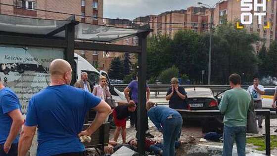 SHOT: в Подмосковье автомобиль снес остановку с людьми, есть пострадавшие