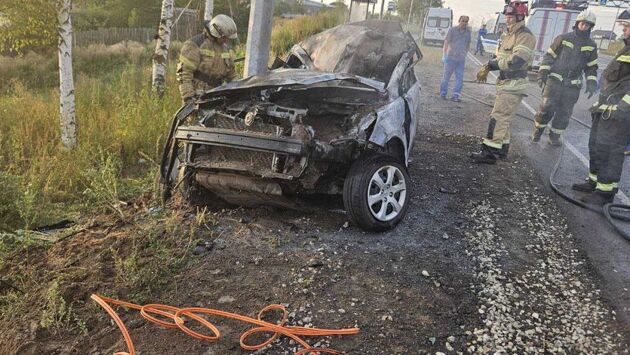По предварительным данным, 36-летняя водитель «Хендай Солярис» не справилась с управлением и врезалась в столб. От удара автомобиль загорелся.
