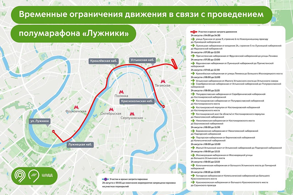 Итак, 24 августа движение будет закрыто с 04:30 до 14:30 на улице Лужники, по Новолужнецкому проезду и Лужнецкой набережной.