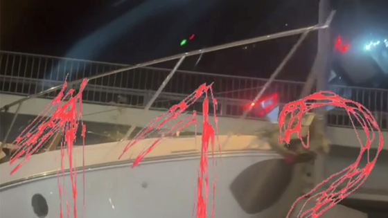 На кадрах видно, что под эстакадой стоит грузовик, в прицепе которого закреплена большая яхта. Предполагается, что перевозчик не рассчитал габариты судна и оно застряло под мостом.