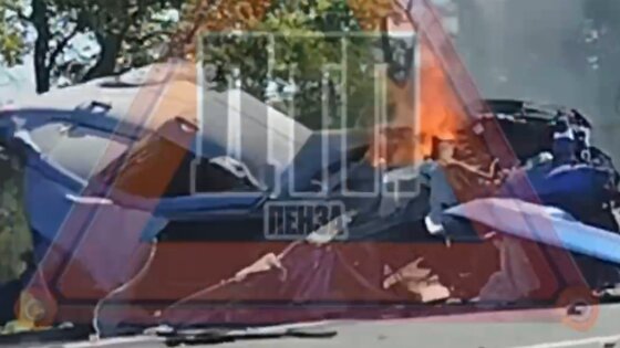 После столкновения легковая машина превратилась в груду металла, которая перекрыла движение по полосам. На кадрах с места происшествия видны языки пламени, вырывающиеся из покореженного кузова. У грузовика разбита передняя часть.