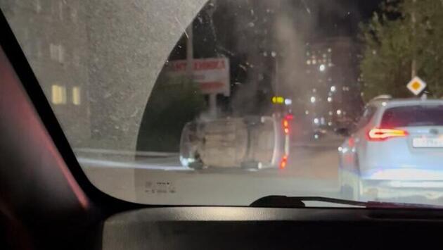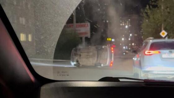 Одна из машин перевернулась и лежит на боку. Левая полоса оказалась перекрыта.