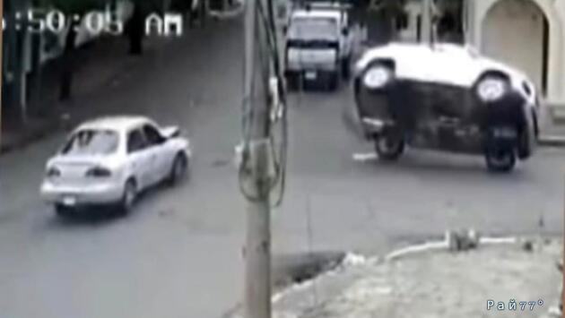 Камера видеонаблюдения запечатлела момент столкновения двух автомобилей, в результате которого один из них перевернулся на улице 27 мая, в столице Никарагуа.
